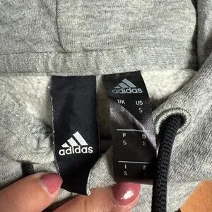 Cozy Adidas sweatshirt with bold logo. Features classic stripes on sleeves. Size S