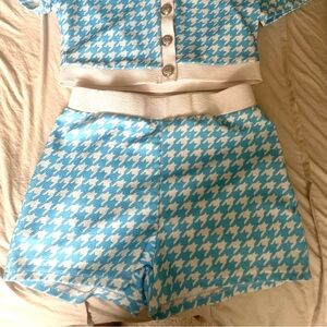 Blue and white houndstooth two-piece set. Short-sleeve top with gold button details and matching shorts.