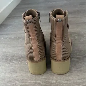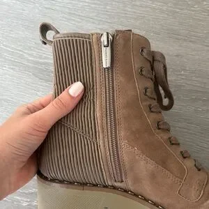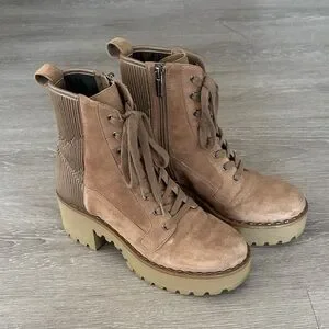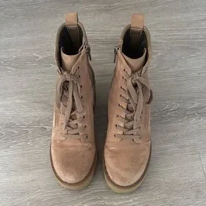 Brown lace-up boots with chunky sole. Perfect for versatile wear, very comfortable! Slight wear and tear throughout, but still in great shape.
