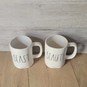 Charming Rae Dunn mugs with 'Beauty' and 'Beast' text. Ideal for couples.