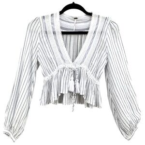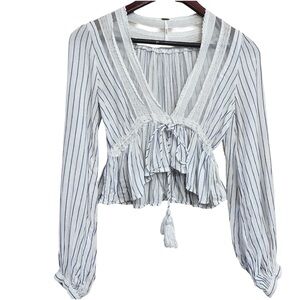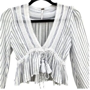 Statement Top from Free People. Mesh and lace accents with plunging v neck. Breezy cotton in a classic white and blue striped pattern. Tassel tie at adjustable peplum bodice.