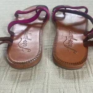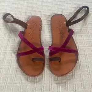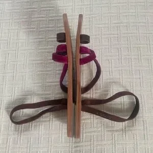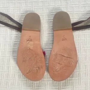 The ‘Isle of Capri’ style. Flat, with violet cross top straps. Brown leather toe loop & ankle strap. The ankle strap is unique, as it is diagonal. Tan footbed & wooden sole. She’s the best blend of classic yet quirky. Sold out on FP site. Ad included.