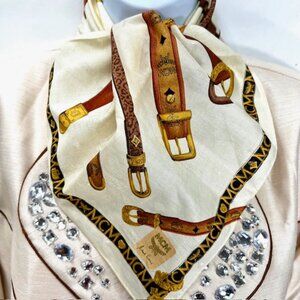 New tag On MCM mini scarf handkerchief cotton 21" Ivery Black Belts Logo ( 28)