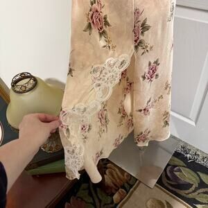 Vintage 90s California Dynasty beige and pink floral pattern satin sheer lace trimmed rosette maxi slip dress - Size Medium, see measurements below!