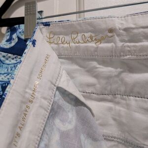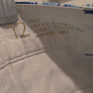 Fun Lilly Pulitzer Jayne style 7” Bermuda shorts with a vibrant blue and white elephant pattern (“Deep Indigo Joy Ride” print). Features a button closure and belt loops. Perfect for casual outings.