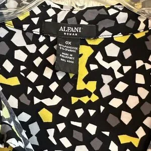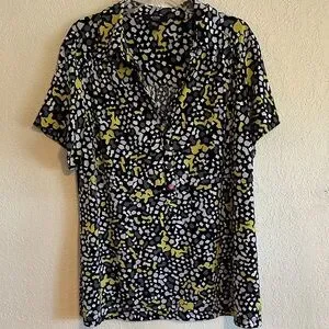 Chic blouse with an abstract black and yellow design. Perfect for versatile styling. Half closure on front with silver buttons and collar.