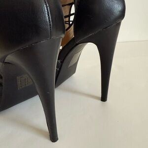 Elegant black heels with open toe design. Features lace-up tie detail. Perfect for evening wear. Size 9. Heels 4.75”. Style: Lianna Faux leather. Vegan