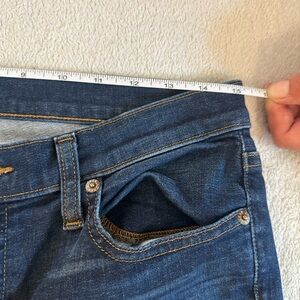 Classic J. Crew blue denim jeans with a tan leather patch. Ideal for everyday style.