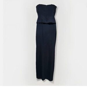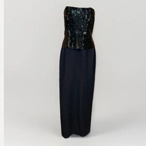 This beautiful one-piece column gown has a beautiful beaded bodice & long pencil skirt with back slit as well as a hidden back zip with hook-and-eye closure.