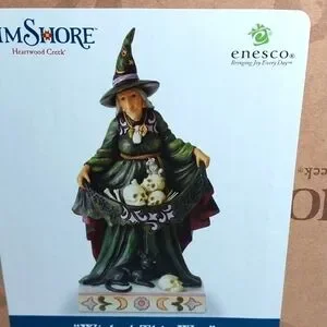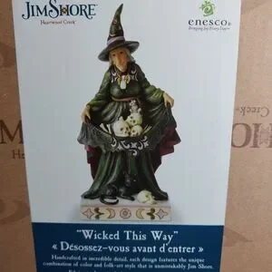 Brand new inbox. Jim Shore Enesco Witch - Wicked This Way. Figure of witch holding some skulls made from stone resin. still inclosed in original packaging- tape never removed. size 4.8" L x 9.75" H x 4.02 W