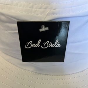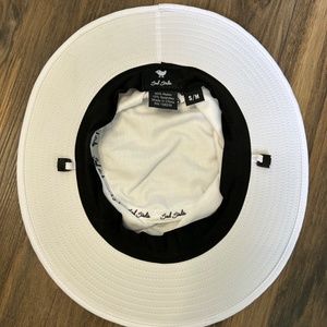 Stylish white bucket hat with black bird logo. Perfect for sunny days.