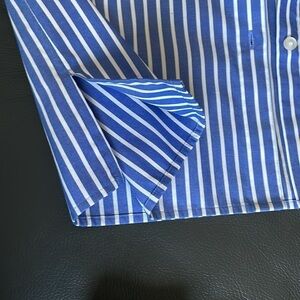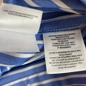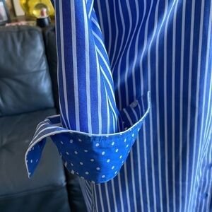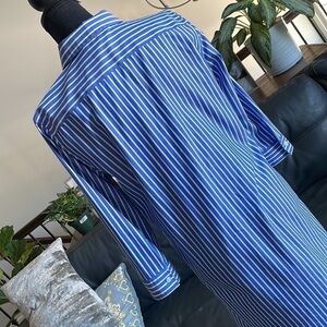 100% Cotton Blue & white striped straight shirt dress features top-to-bottom button front, small side slits, and breast pockets. Polka dot decorative detail on inside collar and sleeve cuffs; dress profile has a preppy vibe. Dress is form-fitting and true to size small.