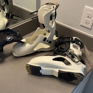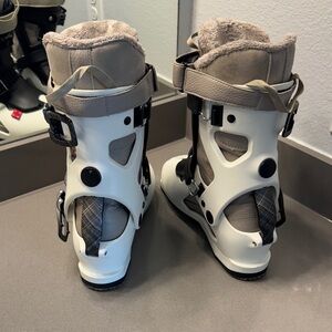 Stay warm and stylish with these women's ski boots. Featuring a cozy cream exterior and durable black accents, these boots are perfect for ski adventures and apres! Detachable shell with internal walking boot. Tired of foot pain and walking in your ski boots? Ideal for those who need ultimate comfort while skiing, long walks to the slopes and apres. Mondo 25.5.
