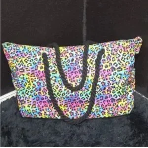 Vibrant and stylish, this colorful leopard print tote bag is perfect for adding a pop of color to any outfit. Featuring a bold design with black handles, it's both fashionable and functional.