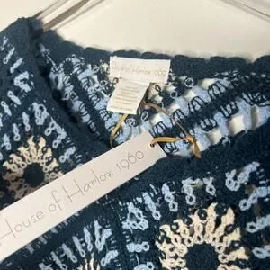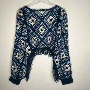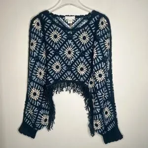 House of Harlow 1960 Crochet Knit Cropped Fringe Pullover Poncho Top O/S