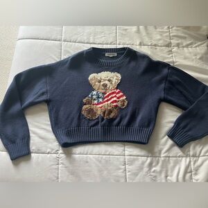 Cozy navy sweater featuring an adorable teddy bear design. Perfect for adding a playful touch to your wardrobe.