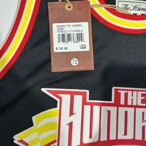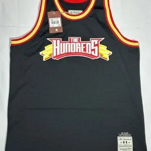 The product is a new with tags Mitchell & Ness The Hundreds black basketball jersey in size L. This stylish jersey is designed for men who are fans of The Hundreds team and enjoy playing basketball. With its sleek black color and high-quality construction, this jersey is perfect for those looking to represent their favorite team while hitting the court.