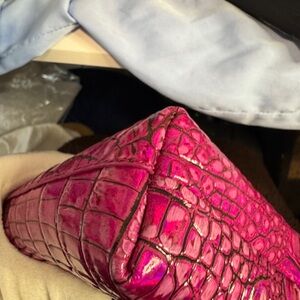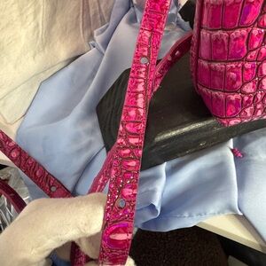 Add a stunning pop of color to your look with this eye-catching Pink Potion Brahmin Crossbody Purse. Featuring a crocodile-embossed exterior with holographic and iridescent finishes, this chic accessory is as unique as it is stylish.