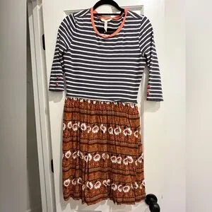 Stylish midi dress with navy stripes and vibrant orange floral skirt. Features button accents on sleeves.