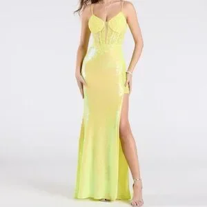Lace-Up Corset Slit Sequin Yellow Evening Gown