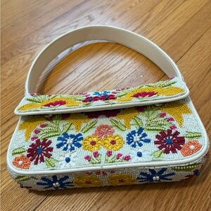 STAUD. WORN 2X. Chic and stylish, this floral beaded handbag is perfect for any occasion. The intricate beadwork adds a touch of elegance to the white base, making it a standout accessory.