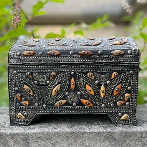 Antique, Moroccan, collectible, boho decor, tribal, box, chest, evil eye, intricate, handcrafted, chest, box, metal, brass, bone, wood, artsy, artisan