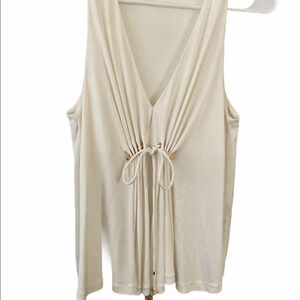 Sleeveless with plunge neckline (Flaws: 😊It was so plunging for me that I have to do a small hand alteration to fit me and I cut off the label because it bothers my skin😊)