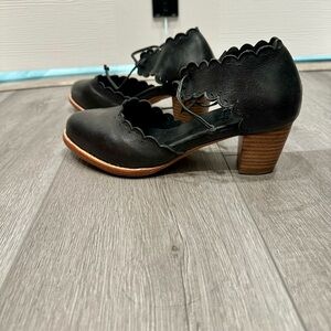 Chic black leather heels with scalloped design. Features an amazingly comfortable block heel and elegant lace-up detail. Great for a night out dancing!