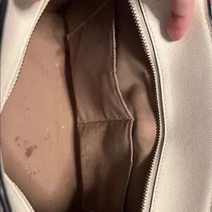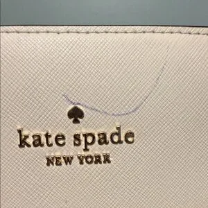 structured Kate Spade Purse. comes with Original Black purse strap & stylish pink Kate spade logo purse strap. Two small pen marks on purse - which I have imaged. One small stain on the interior bag lining along the bottom. Aside from these small signs of being a work loved purse, this bag is in perfection condition. There are no scratches in the leather. The zipper is not tarnished and works perfectly. The interior silk lining has no rips or tears.