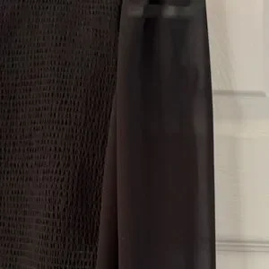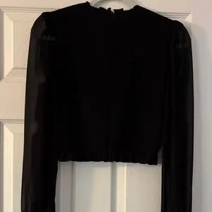 This elegant black top features long sleeves and a chic design, perfect for any occasion. Its versatile style makes it a must-have in your wardrobe. Sleeves are sheer and the material is polyester and it is a crinkle feel.