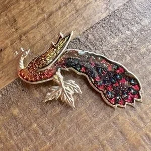 This vintage peacock pin is really quite charming. It has enamel with glitter on its body and tail feathers. The head and the leaf are in a thin metal with a goldstone finish.
