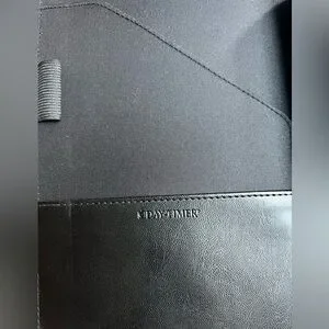 Item # 92121TA. This is a Vintage style Day-Timer, Black Leather stitched 7-Ring binder New and filled with blank pages. This Organizer has a snap closure. Measures 9 x 7 inches. Unsure if this was ever used. Clear pages look brand new. There may or may not be section missing.