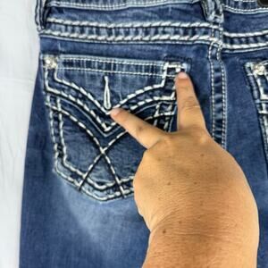 Miss Me Chloe Bootcut Jeans, size 29. Blue denim cotton blend, midrise stretch. Style T3275B. Embroidered and rhinestone detail on the back, missing one rhinestone and one button. The button is just for decoration, no functionality. Good condition with no stains. LAYING FLAT MEASUREMENTS: waist 14" rise 9" inseam 32"