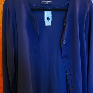 Lane Bryant lightweight cardigan with button closure. Features a crewneck, ribbed trim, and long sleeves. Classic navy color will go with everything.
