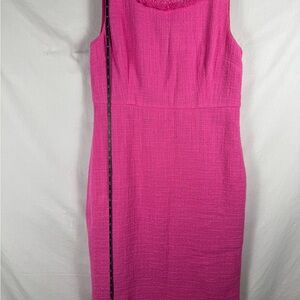 The J.Crew Pink Tweed Sheath Dress in size 12 is a chic and versatile piece, perfect for work, events, or special occasions. Crafted from a cotton-blend tweed fabric, this sleeveless dress features a round neckline with fringe trim at the collar and hem for a refined touch. Designed in a classic knee-length sheath silhouette, it’s fully lined for comfort and quality. Machine washable for easy care.