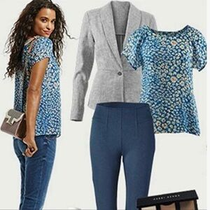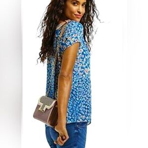 Stylish CAbi top with blue & Red vibrant floral pattern. Short sleeves and comfortable fit. Crossover fabric in the back & flowy. #299