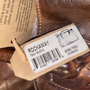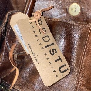 Rich brown leather with a distressed finish. Dual handles and adjustable shoulder strap. Perfect for everyday use.