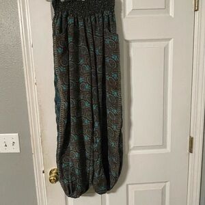Experience the perfect blend of comfort and style with EARTHBOUND's wide leg pants in a striking blue and brown color palette. These pants feature a relaxed fit and a flowy silhouette, making them ideal for both casual and dressy occasions. Crafted from lightweight fabric, they offer a breezy feel and effortless movement. The intricate geometric patterns add a touch of elegance to your wardrobe.