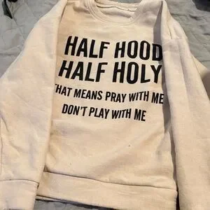 Beige sweatshirt with bold black text: 'Half Hood Half Holy'. Estate Sale Items!I love storage wars and rummage sales!One person’s horde is another person’s treasure!I hope you find your treasure in my collection!!I post updates to pictures as requested but I can’t guarantee exact conditions with used merch.💕Ty
