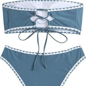 Two Piece Bikini: Padded Bra, Strapless, Good Elasticity, Lace up design, Gathering,Cheeky Bikini.