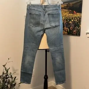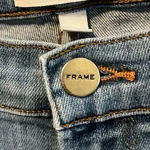 Frame le garcon skinny jeans. Traditional jean styling with button and zip closure and scoop pockets at front hips. Patch pockets at back. Waist is 15.5”, rise is 10”, inseam is 29”, and length is 39. There’s a bit aware at hem of legs, but otherwise EUC.
