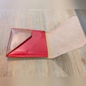 Like new. Stylish whisky brown leather wallet with red leather accents by Open Sea Leather. Features unique stamping and stitching details.