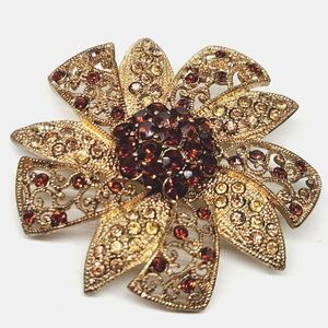 Elegant Vintage Filigree Open Scrollwork Flower Amber & Champagne Rhinestone Gold Tone Brooch 2+". Please feel free to ask questions.