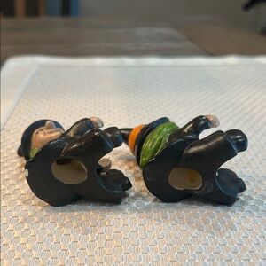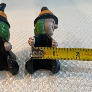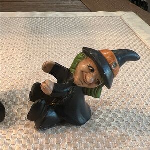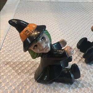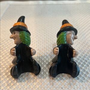 Set of whimsical witch candle holders with green hair and black outfits. Perfect for Halloween decor.