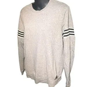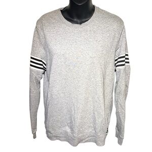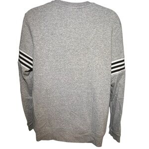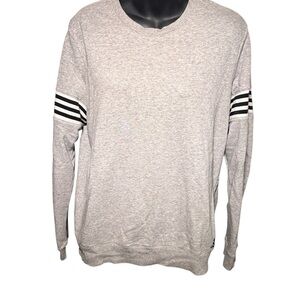 A great basic for lounging or working out. Gray pullover sweatshirt with black and white stripe detailing on the sleeves. Adidas emblem on the bottom near hem. Brand is Adidas, size large