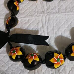 Black Kukui Nut Hawaiian Luau Lei Yellow Gold Flower Necklace NWOT