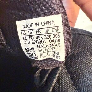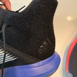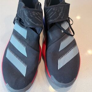 Sleek Adidas high-tops in black and red. Features blue accents. Perfect for sports and casual wear.