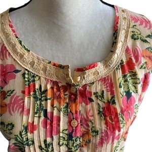 spring and summer top, yellow orange and pink floral, button front, pleated fro t, sleeveless, excellent condition, size small