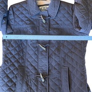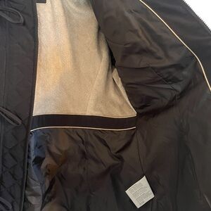 Faux fur polyester lining, full zip closure with toggle buttons, and side slit pockets. This jacket does not have a hood