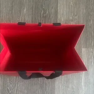 Bold red tote with sleek black handles. Ideal for everyday use.
